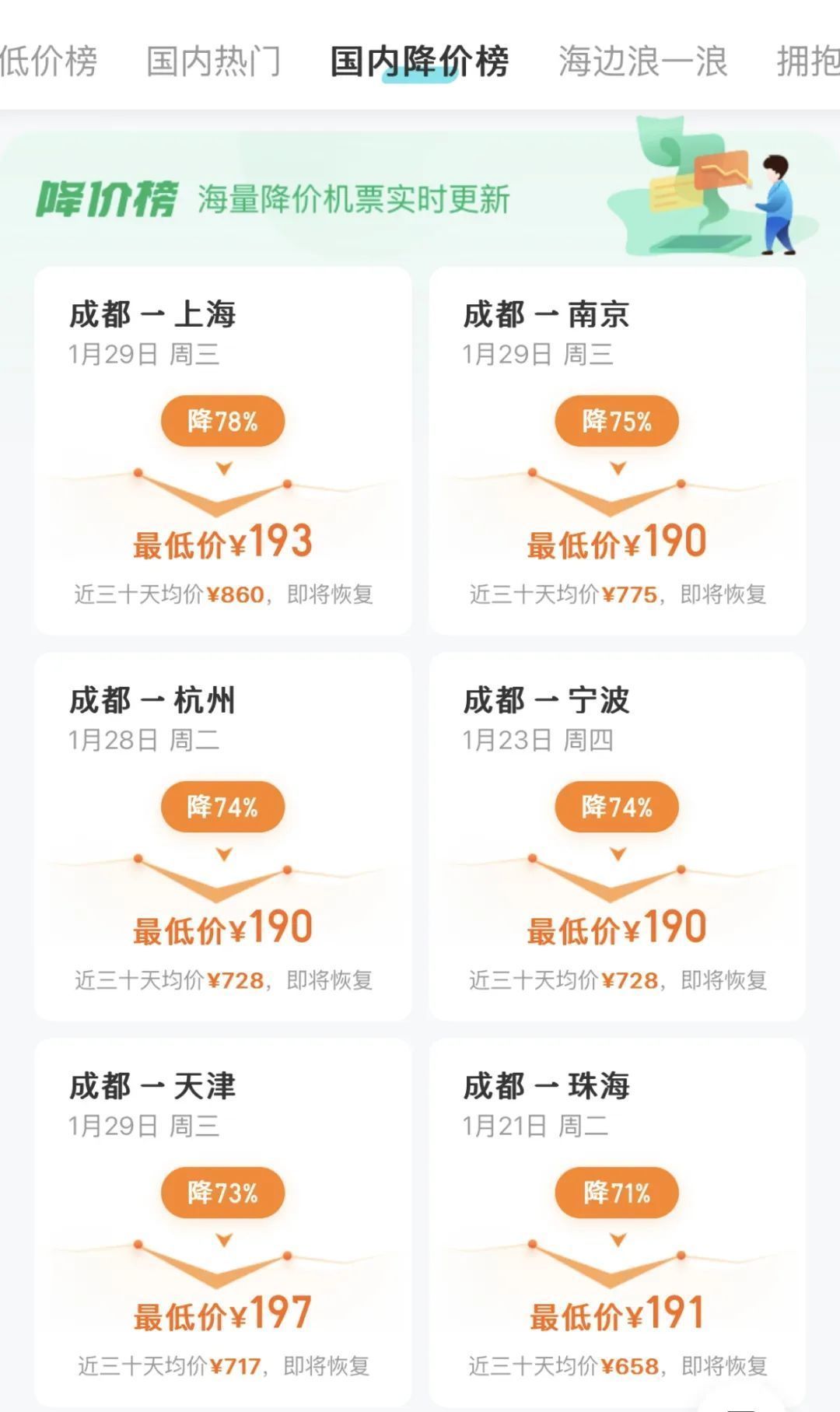 以成都出发的机票为例,春节假期期间,成都到上海降价78%、到南京降价75%,到杭州降价74%。